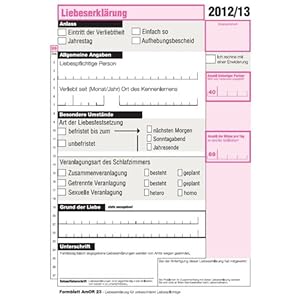 Bei Amazon könnt ihr heute für 1,49 Euro + 3,90 Euro Versandkosten eurer/eurem Liebsten eine Liebeserklärung schicken. Typisch für Deutschland gibt es für fast alles ein Formular, warum dann nicht eines für Liebeserklärungen? Kurz ausfüllen und ab geht die Post.