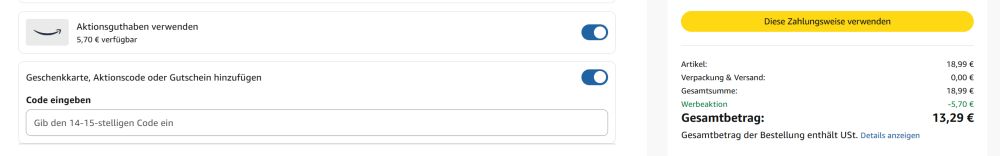 Ich muss aber in letzter Zeit öfter mal danach nochmal in den Warenkorb gehen und dann erst zur Kasse, damit sich der Preis aktualisiert.